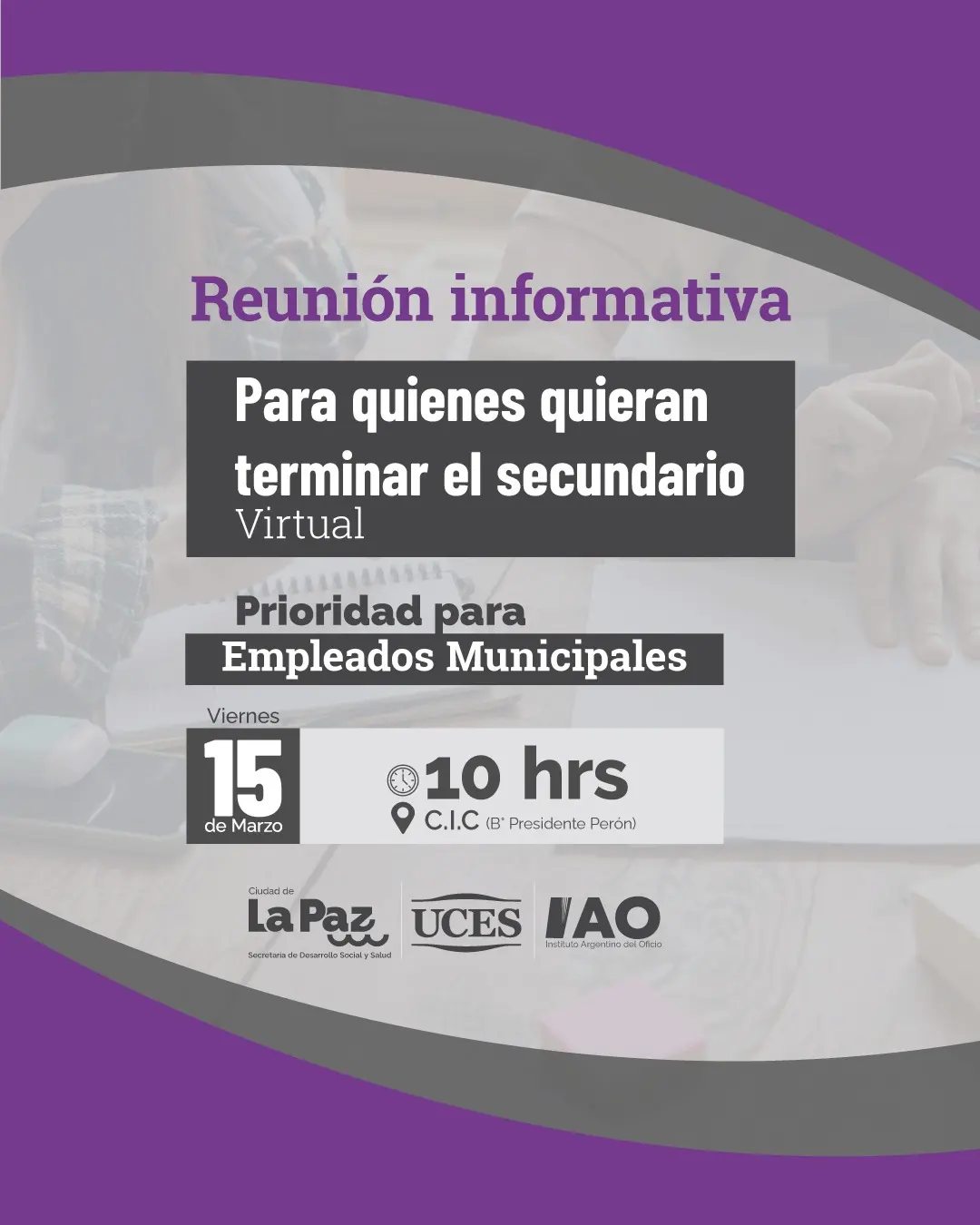 Desde el Gobierno de la Ciudad informan que, este viernes 15 en el C.I.C de barrio Presidente Perón, se estará realizando una reunión informativa para aquellas personas que deseen y necesiten terminar los estudios secundarios.